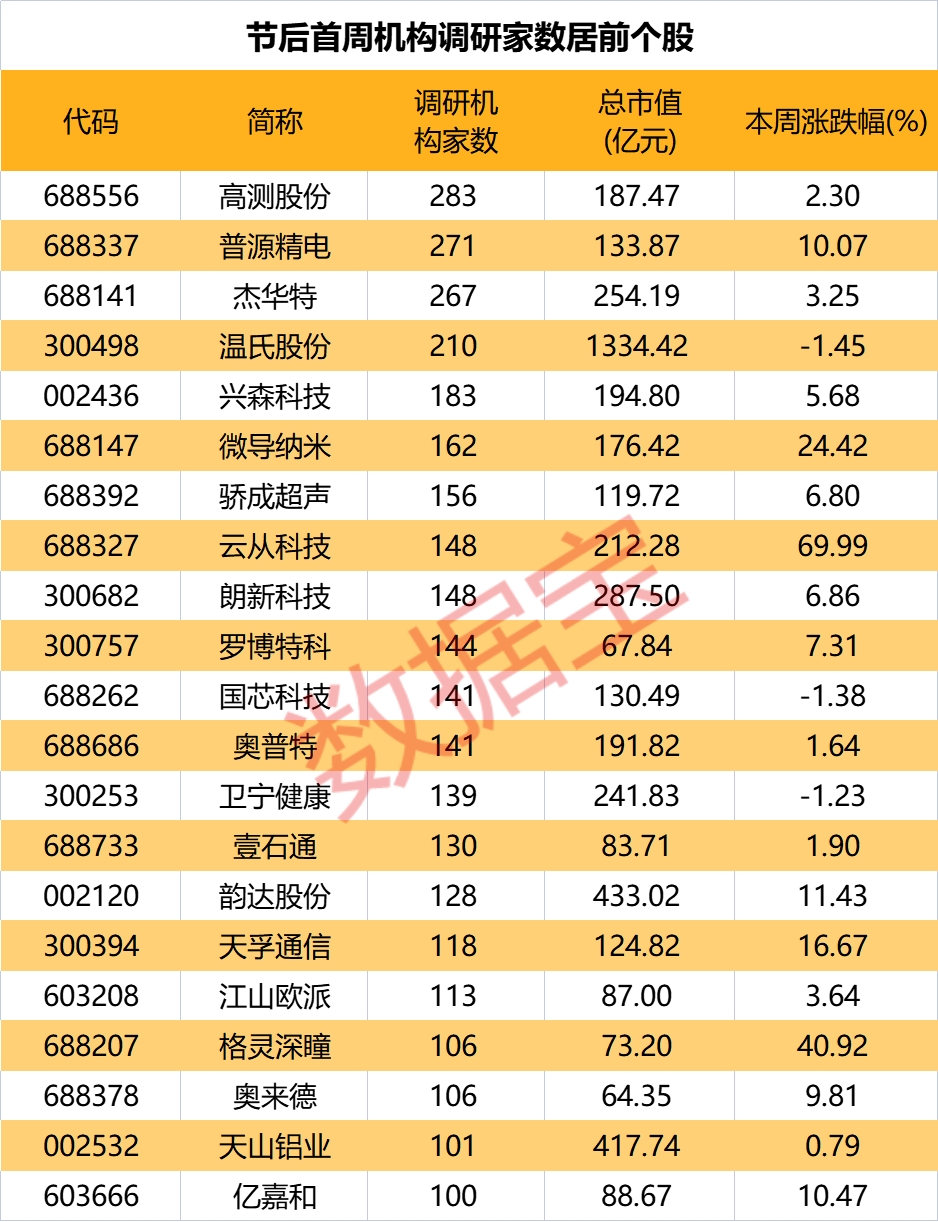 数据宝统计,节后首周,共计21股获百余家机构调研。除高测股份外,普源精电、杰华特和温氏股份调研机构家数居前,均逾200家。