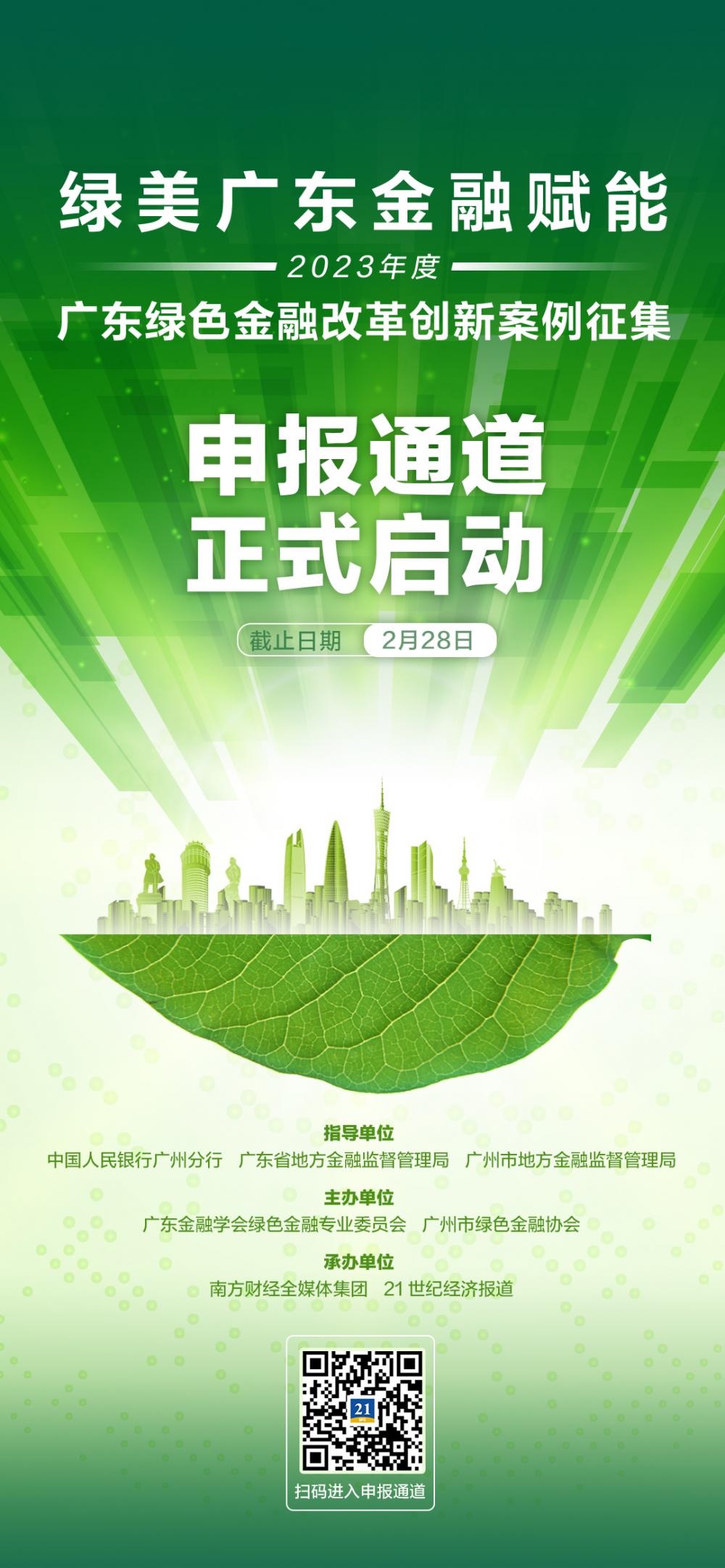 案例征集和推广活动由中国人民银行广州分行、广东省地方金融监督管理局、广州市地方金融监督管理局指导,广东金融学会绿色金融专业委员会、广州市绿色金融协会主办,南方财经全媒体集团、21世纪经济报道承办。