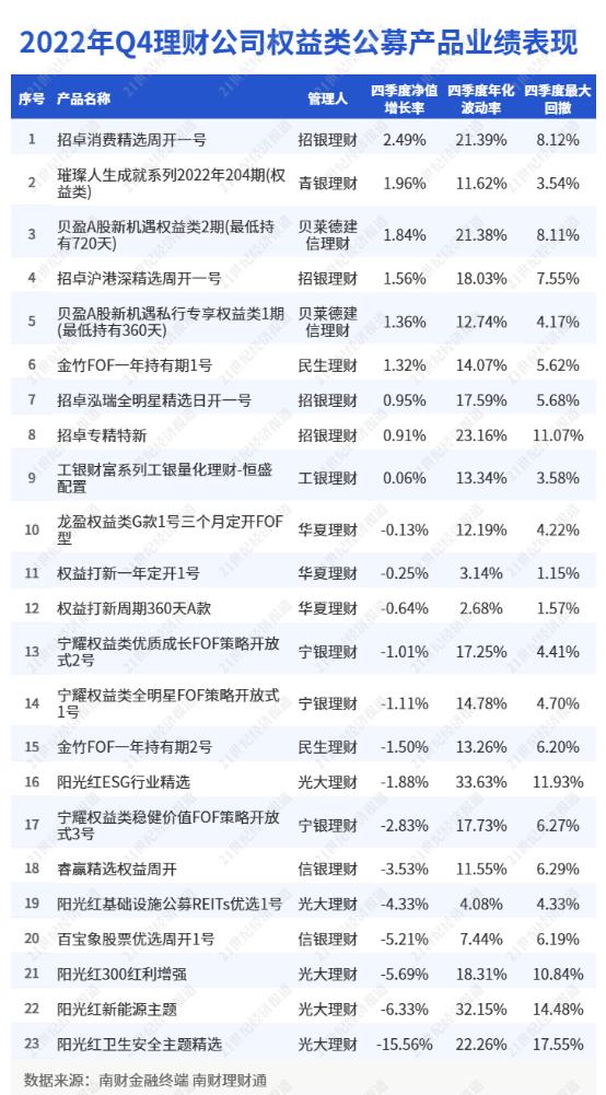 根据南财理财通数据,截至2023年2月6日记者发稿,理财公司存续的权益类公募产品(包含母行划转的老产品)共有25只。其中,成立时间在2022年10月1日之前且结束时间在2022年12月31日之后的产品有23只。