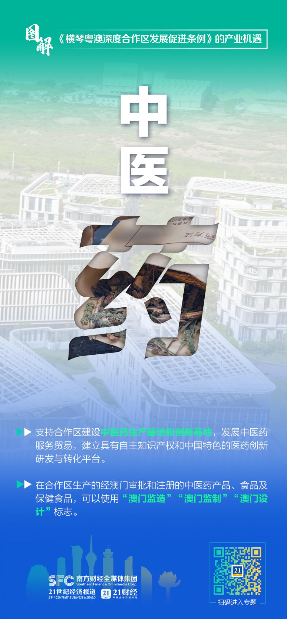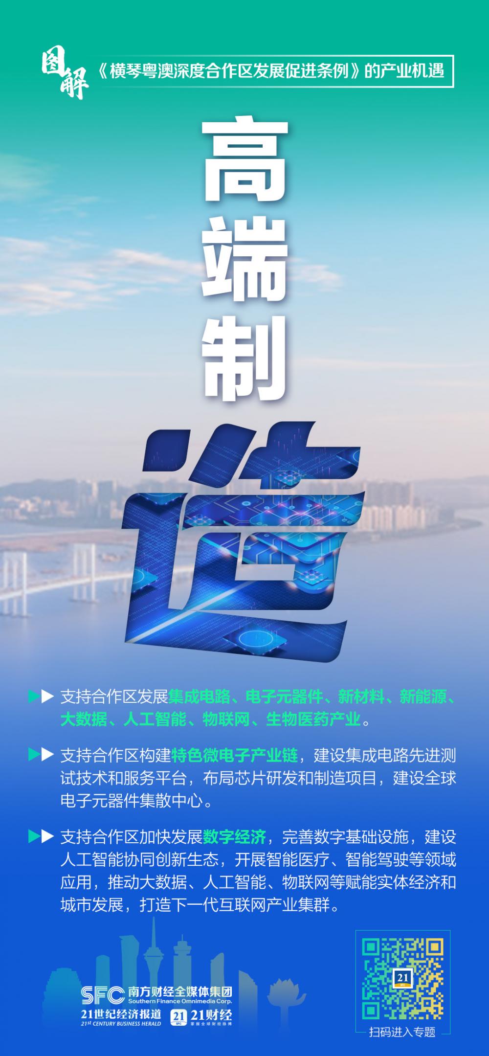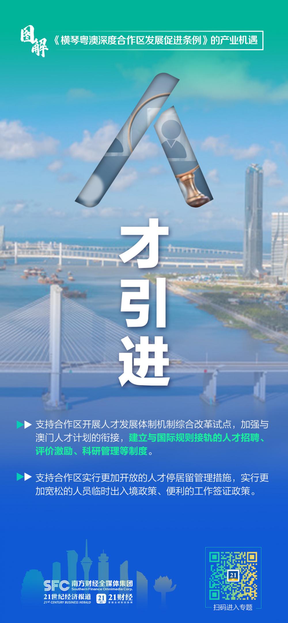 在促进产业发展方面,《条例》指出,合作区应当编制产业发展规划,发展促进澳门经济适度多元的新技术、新产业、新业态、新模式,重点发展科技研发和高端制造、中医药、文化旅游会展商贸、现代金融等产业。