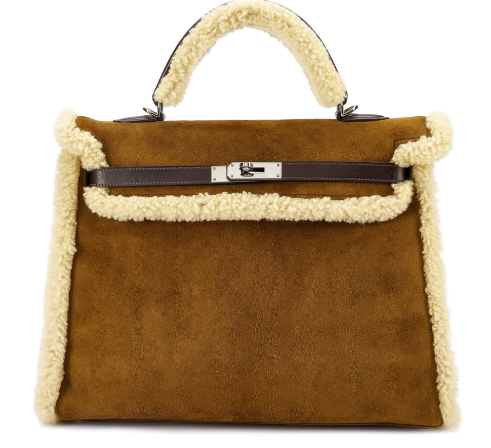 外表主要由棕褐色麂皮和羊毛皮制成,洋溢着冬日的暖意温馨。手柄上乌木色的小牛皮装饰,也让这款限量版手袋更显经典优雅。这款包包目前的估价为15万至26万港元。