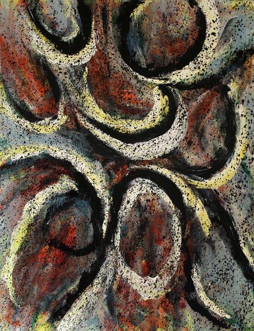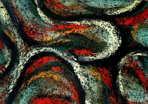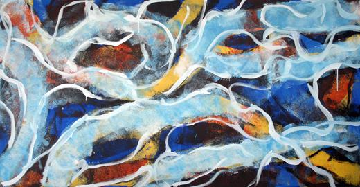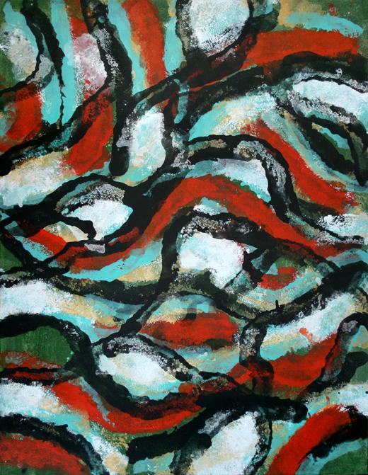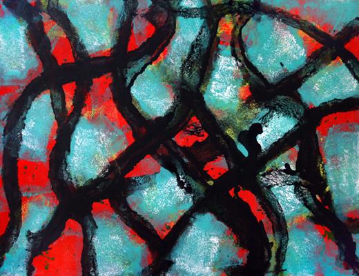 画面上的网状结构是由不同颜色的团块状色块建构起来的,有着看起来非常理性的秩序,但画家有时或厚或薄地以画刀刮去团块里面本身的颜料之后,不同的团块都有了生动的表情——一直奇妙的姿态语言,而且线条本身的轮廓一直保持清晰,在团块与团块之间,团块与线条之间,线条与线条之间,尤其在轮廓线被塑形膏加固后,线条与团块之间的关系得到了更加丰富的表现:似乎是线条在困住团块,似乎又是团块与团块之间要突破线条的限制,彼此在挤压,在变形,在蠕动,所形成的张力使“重”的双重性——重力与重复——同时被呈现出来!