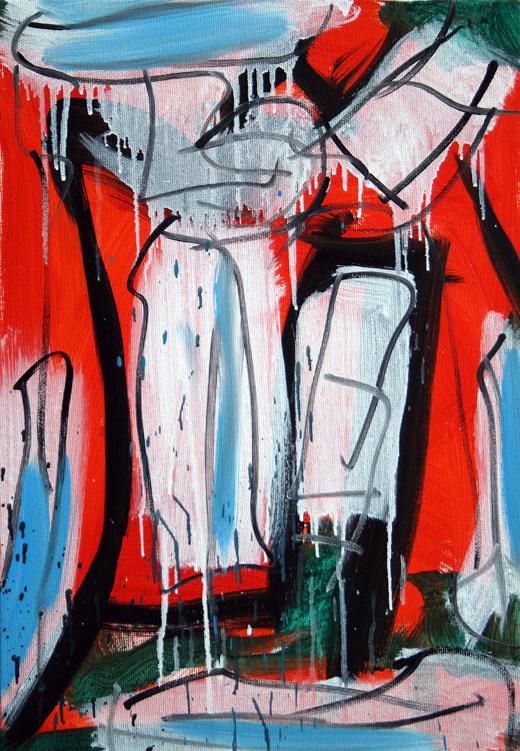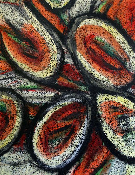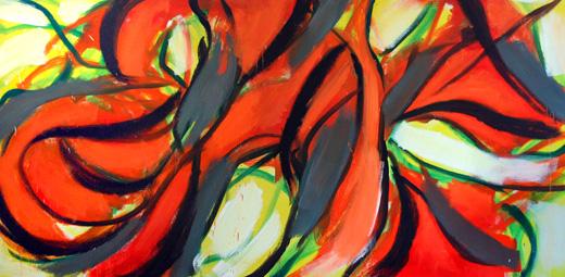 这些网状的结构其实并不仅仅是抽象的色块,而且其中隐含着具象——当然只是暗示:艺术家早期的作品深受表现主义影响,带有抽象表现主义风格,因此,网状结构的形式化构图有时也带有了暧昧的形象。艺术家无疑投射了个体生命的激情,或者说生命的血性在色条上充盈着,线条依然还在承受肉体的重负——现在是欲望的内爆!