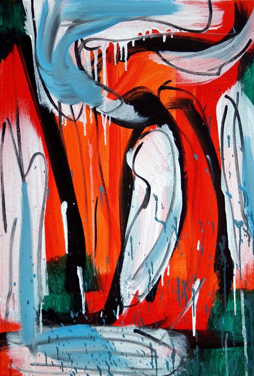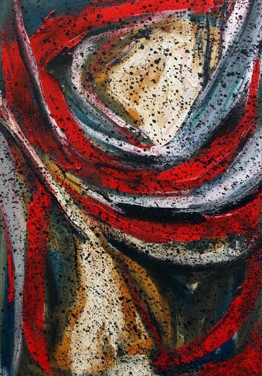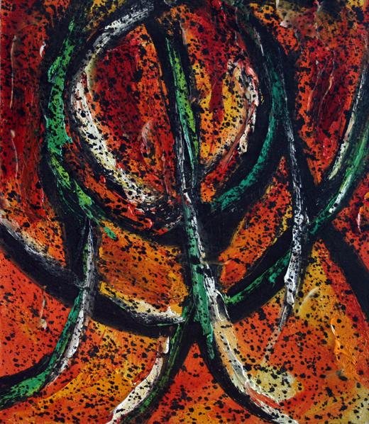 这是艺术家自己反复思考的问题:“必须经得起抵抗材料特征的考验,能够化现,也能够化隐!”——必须从材料本身,从线条作为有着内在颜色的线条,从色条和色块本身的内在变化,从颜料本身的可能性上发现可能性——不是外在地赋予这个线条以意义,而是从线条本身开始自身的改变!线条是应该聚合为向心的形态还是自身破碎和断开?画家所言的“化现”——是对可见的可读的形态的化解,“化隐”——则是如同画家自己所写道的,双重之化:“拒绝构图的复杂性,突出即兴随意的情绪写意,让超自然的感觉渗透画面,安排有效的笔触与色块,让凸凹的痕迹清晰可辨!”