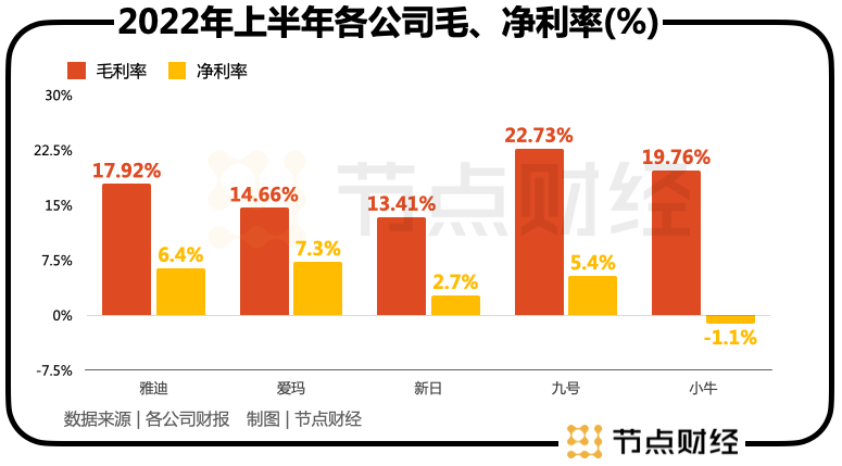 而在2022年上半年,这一局面又有所变化。就毛利率而言,最高的九号能达到22.73%,其次为小牛19.76%,最低为新日13.41%;就净利率而言,爱玛反而翻身居上,以7.29%成了盈利最强的一支,小牛亏损垫底;雅迪虽然卖的最多,但走的还是规模效应路线。