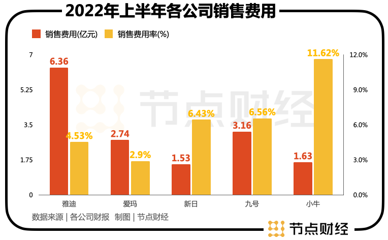 财报显示,2022年上半年,雅迪、爱玛、新日、九号、小牛,分别支出销售费用为6.36亿元、2.74亿元、1.53亿元、3.16亿元、1.63亿元,对应营收占比为4.53%、2.9%、6.43%、6.56%、11.62%。