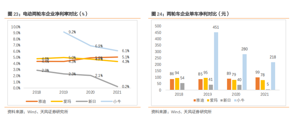 据天风证券统计,小牛的单车净利润遥遥领先其他,最高的2019年达到451元/台,其他家则不足百元,最低的新日只有40来元。