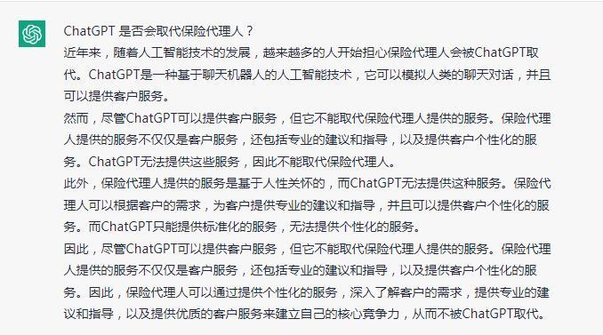 张澜藐告诉《国际金融报》记者,他都不敢相信这是由AI花费2分钟时间写出来的文章。除了推荐的产品不一定买得到,其他方面无论是逻辑还是文笔,都让人赞叹。在他看来,重复的机械工作、不会独立思考的人都会被淘汰,而不限于保险代理人。按理说,保险代理人反而不容易被替代,毕竟保险提供的大多是非标准产品和个性化服务。相反,ChatGPT更应该为代理人所用,辅助其更高效地开展业务。“当然,我们也要更加努力,不断提高自己的专业素养,永远保持自己的竞争力,不被AI技术所取代。”