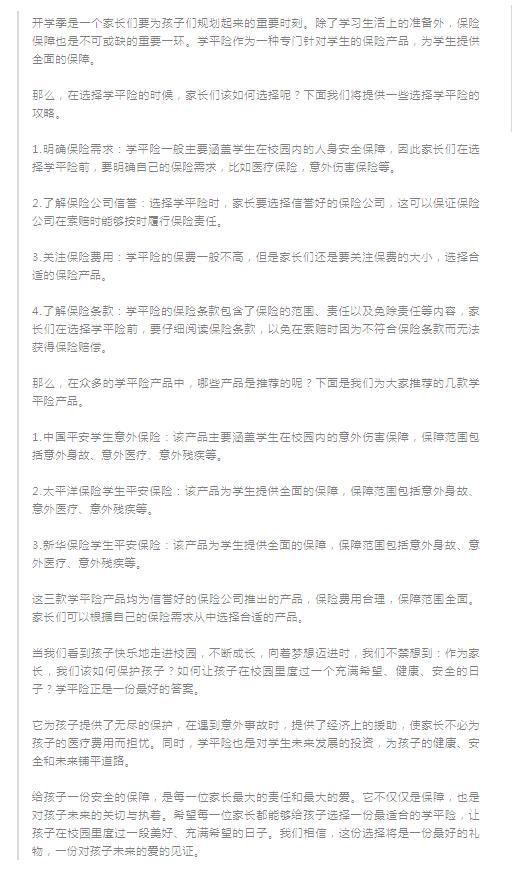 资深保险经纪人张澜藐在自己公众号上直接贴出了一篇由ChatGPT写的文章,题目是《开学季学平险攻略与产品推荐》,内容如下: