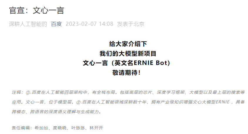 很多企业都在试图“上车”,把自家业务与 ChatGPT 搭上关系。以AI企业标榜的百度宣布,将在今年3月推出大模型“文心一言”。老牌互联网公司360表示,已经对类ChatGPT技术进行研究,并且有可能带来颠覆性的革新。就连做奢侈品生意的寺库,也宣布对相关技术进行研究——反正,只要你敢信,我就敢说。