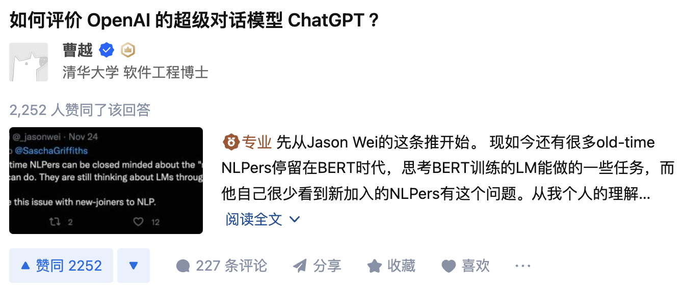 大火的ChatGPT,在知乎平台里也是热门话题。比如一个被广泛讨论的答主观点提到,ChatGPT最让人震惊的能力包括:推理能力,归纳能力,在语言作为媒介展现出来的对世界常识的认知,多轮对话的能力。