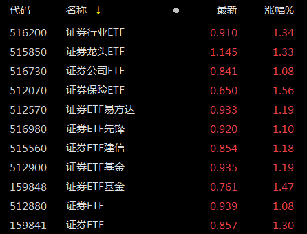 ETF方面,证券保险ETF(512070)涨近2%,证券ETF基金(159848)、证券行业ETF(516200)、证券龙头ETF(515850)、证券ETF(159841)等涨超1%。