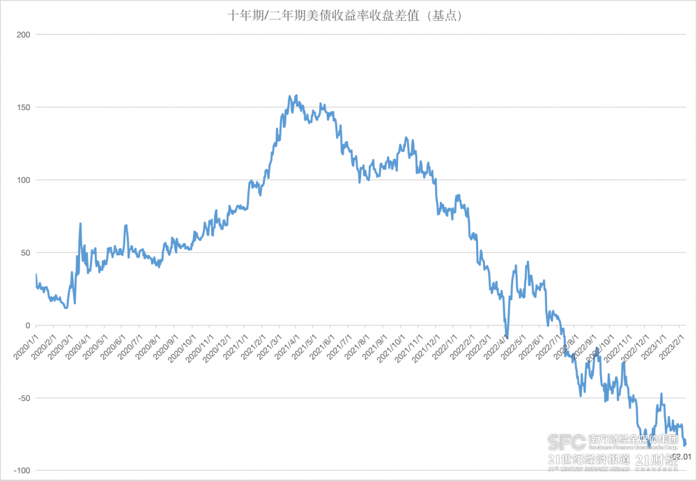 美东时间2月9日,美国2年期国债收益率与10年期国债收益率的倒挂幅度进一步加深,盘中一度达到88个基点,创下了1980年代初以来之最,超过了去年12月的极端水平,不过收盘时收窄至了82个基点。