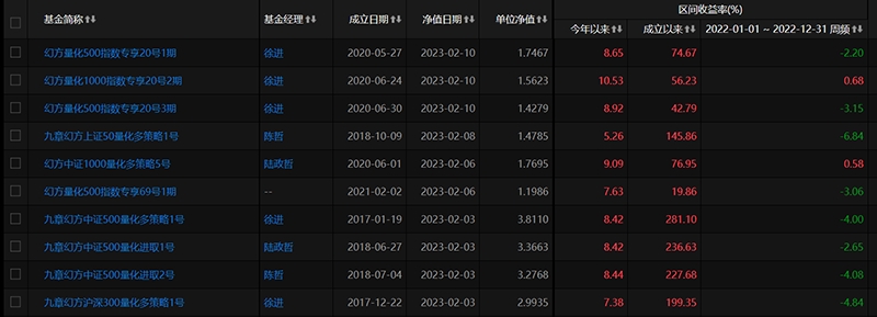 封盘过后,幻方量化业绩逐步走向平稳,2022年在沪深300指数、中证500指数、中证1000指数均跌超20%的环境下,幻方量化大部分指数增强产品取得了15%以上的超额收益。