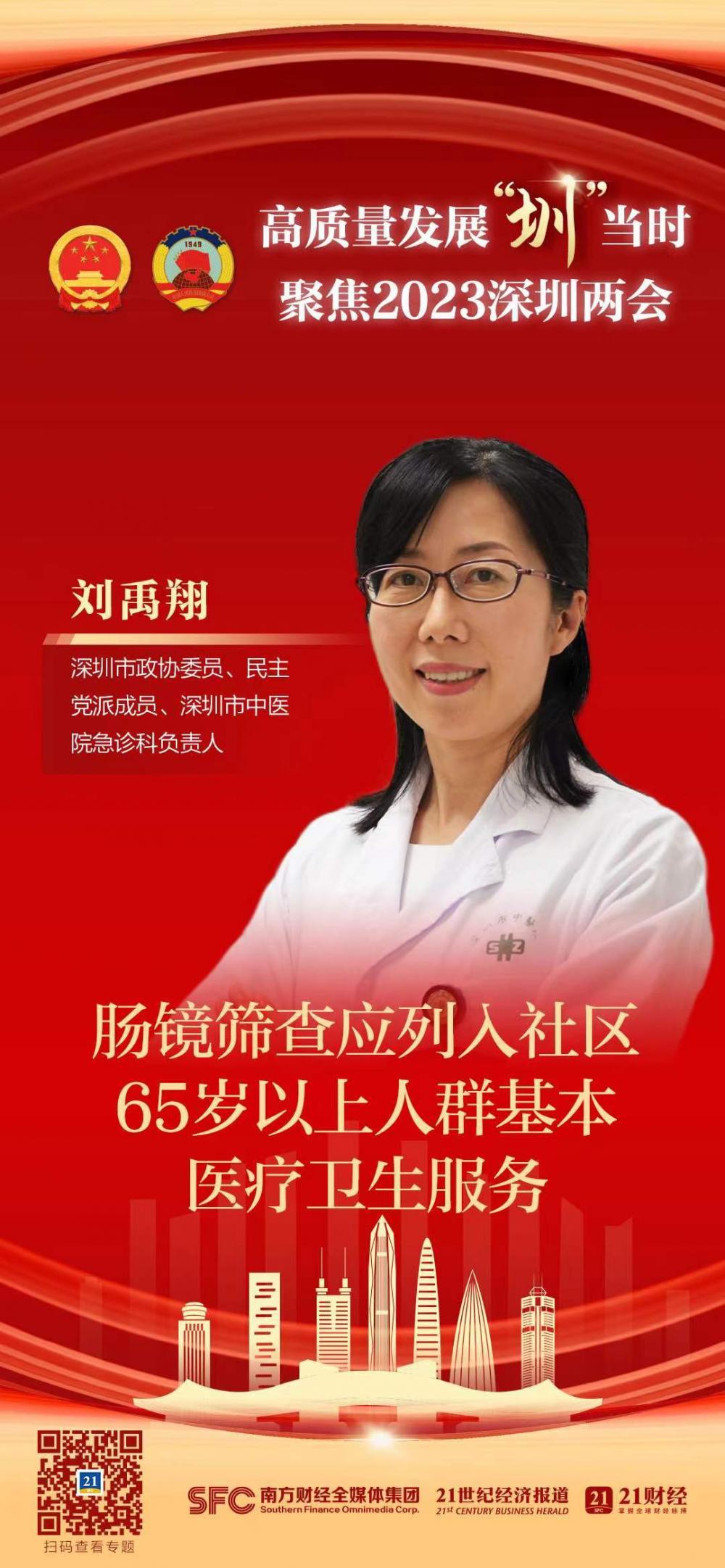 在2023年深圳两会期间,深圳市政协委员刘禹翔提交了关于肠镜筛查列入社区65岁以上人群基本医疗卫生服务的提案。
