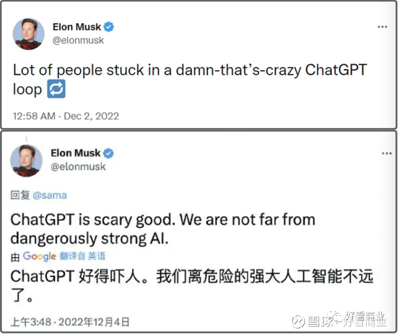 这其中当然少不了马斯克。他在ChatGPT上线第二天发推说,“许多人陷入了该死的疯狂ChatGPT循环中”。12月4日,他又在推特表示:“ChatGPT好得吓人,我们离强大到危险的人工智能不远了。”
