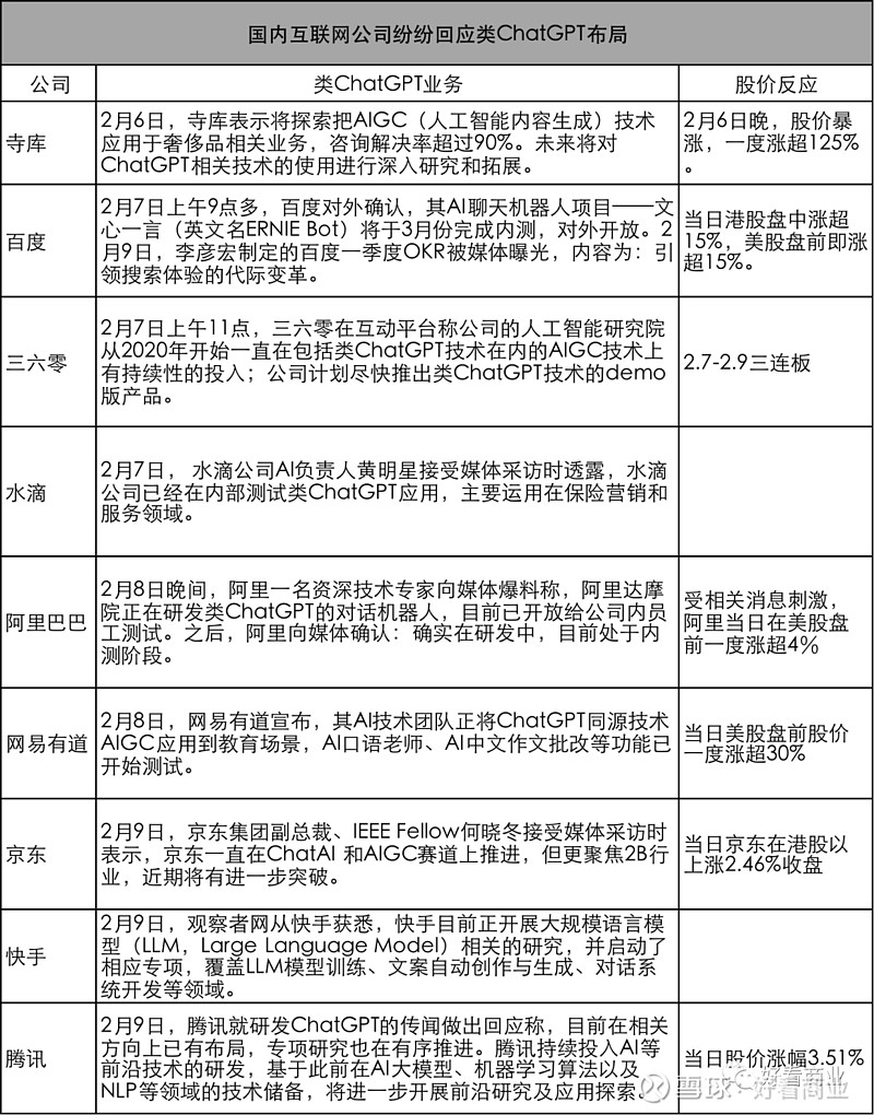 继百度之后,中国的科技公司中,三六零、阿里巴巴、京东、快手、小米、腾讯、网易有道等纷纷表态,回应公司在类ChatGPT业务方面的布局。