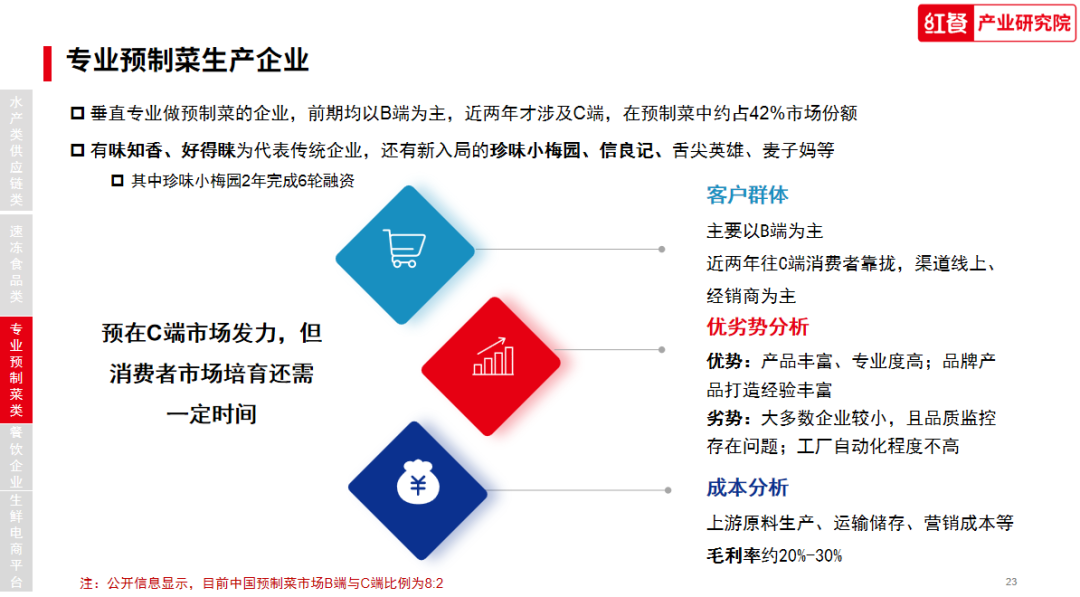其中,专业做预制菜的企业,在预制菜市场占比份额是最高的,约占42%市场份额。专业预制菜企业前期均以B端为主,近两年才涉及C端,以味知香、好得睐为传统代表企业,此外,还有新入局的珍味小梅园、信良记、舌尖英雄、麦子妈等。