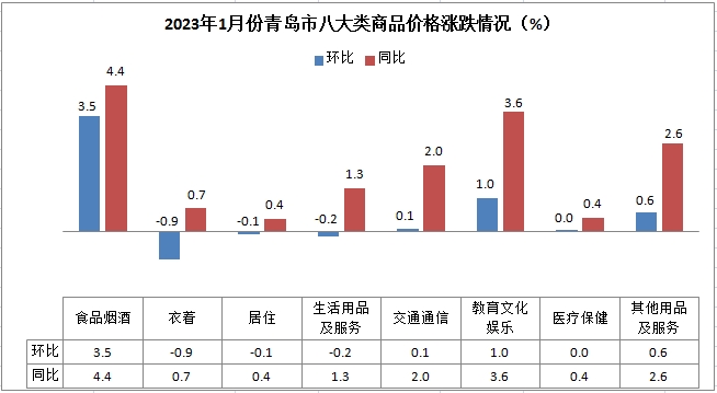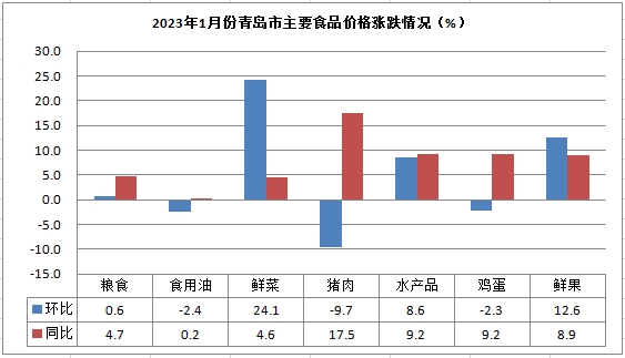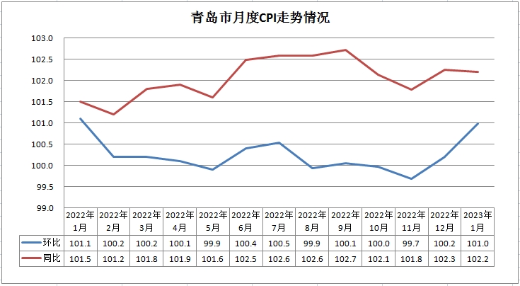 国家统计局青岛调查队监测数据显示,2023年1月,青岛市居民消费价格同比上涨2.2%,其中,食品价格上涨6.1%,非食品价格上涨1.3%;消费品价格上涨2.7%,服务价格上涨1.4%。1月份青岛市居民消费价格环比上涨1.0%。