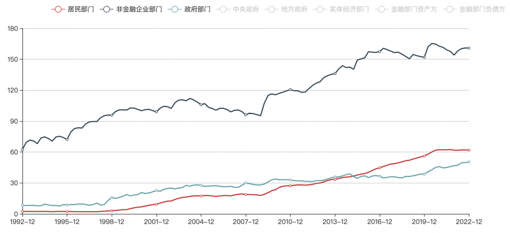 其中,居民部门杠杆率保持不变,仍维持在2021年末的61.9%;非金融企业部门杠杆率上升了6.8个百分点,从2021年末的154.1%上升至160.9%;政府部门杠杆率上升了3.6个百分点,从2021年末的46.8%增长至50.4%。