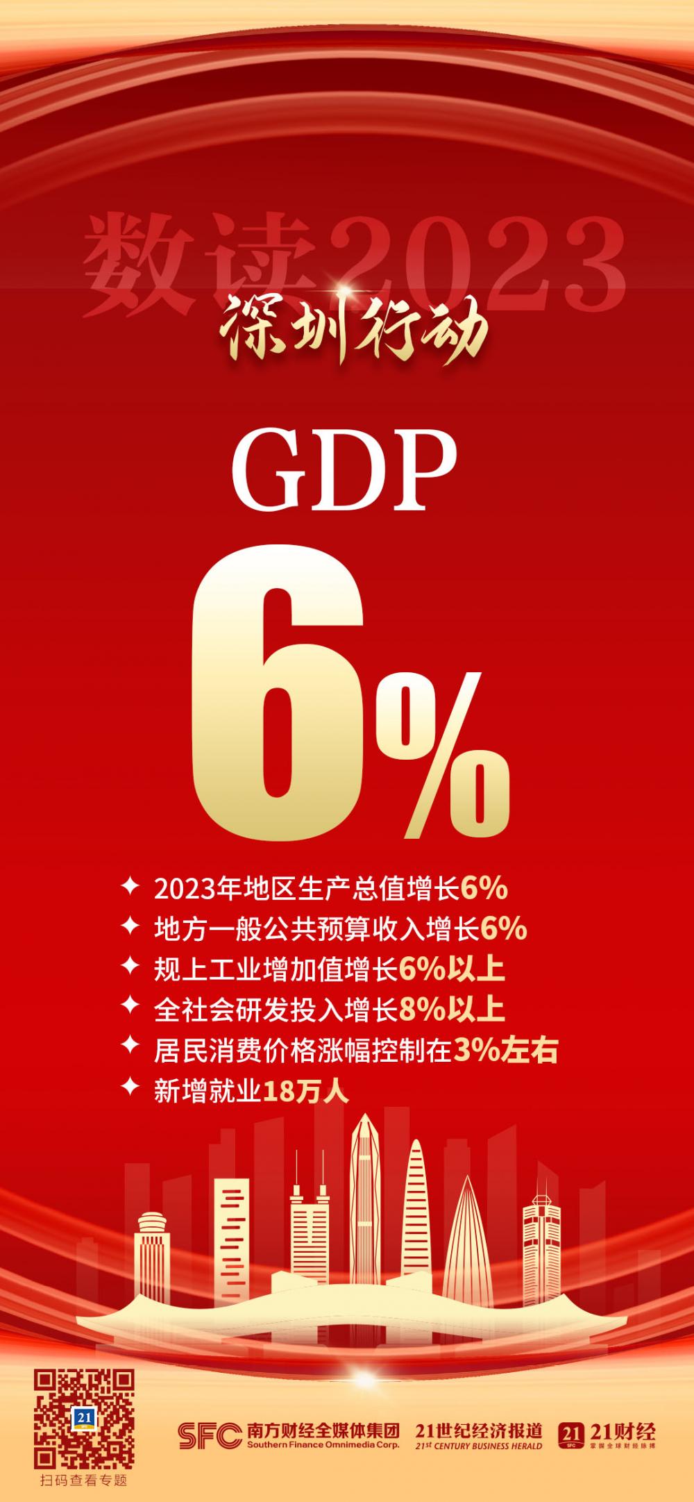 2023年,深圳经济社会发展主要预期目标是:地区生产总值增长6%,地方一般公共预算收入增长6%,规上工业增加值增长6%以上,全社会研发投入增长8%以上,居民消费价格涨幅控制在3%左右,新增就业18万人,居民人均可支配收入稳步增长。