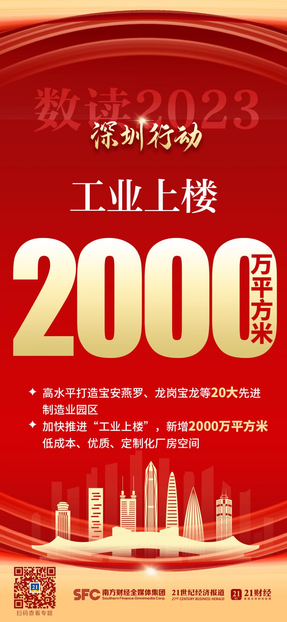 2023年,深圳高水平打造宝安燕罗、龙岗宝龙等20大先进制造业园区。加快推进“工业上楼”,新增2000万平方米低成本、优质、定制化厂房空间。