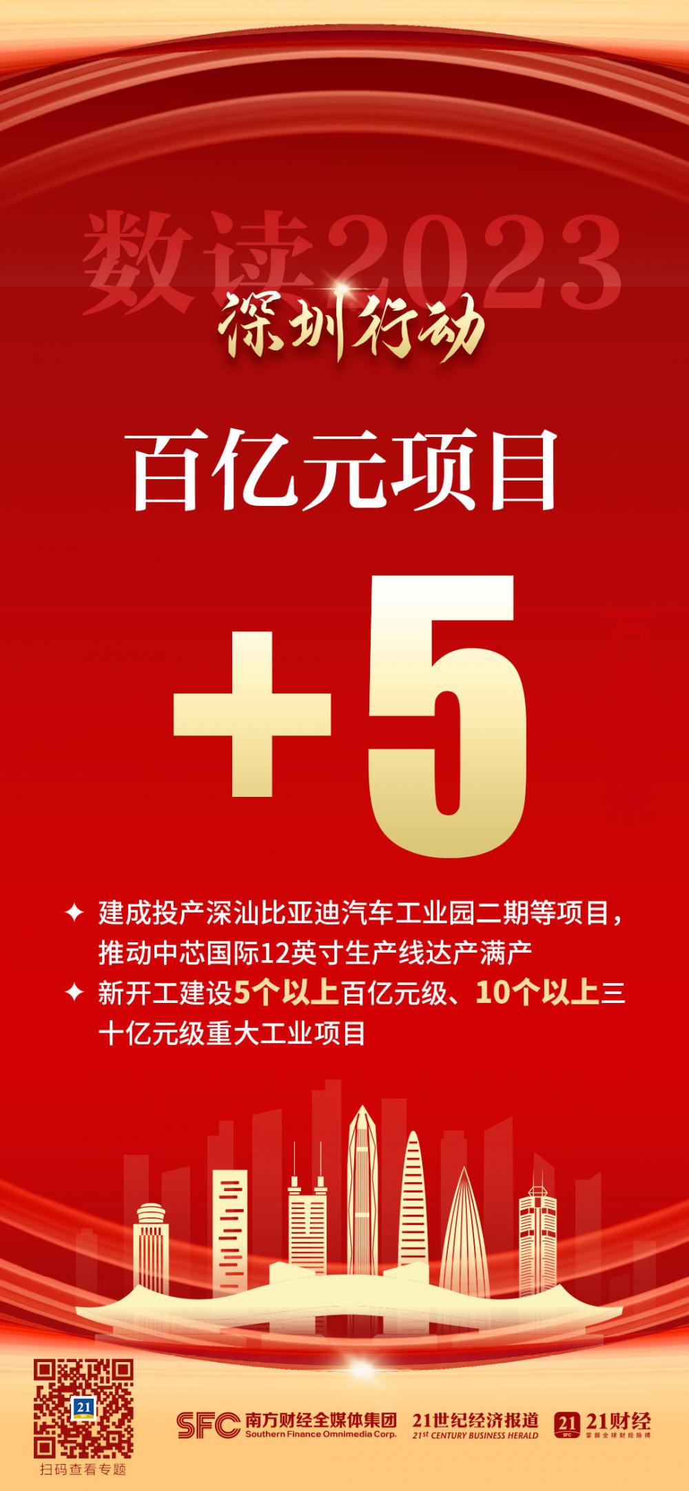 2022年,深圳轨道交通运营里程达559公里,线网密度居全国首位;2023年,建成投产深汕比亚迪汽车工业园二期等项目,推动中芯国际12英寸生产线达产满产。新开工建设5个以上百亿元级、10个以上三十亿元级重大工业项目。