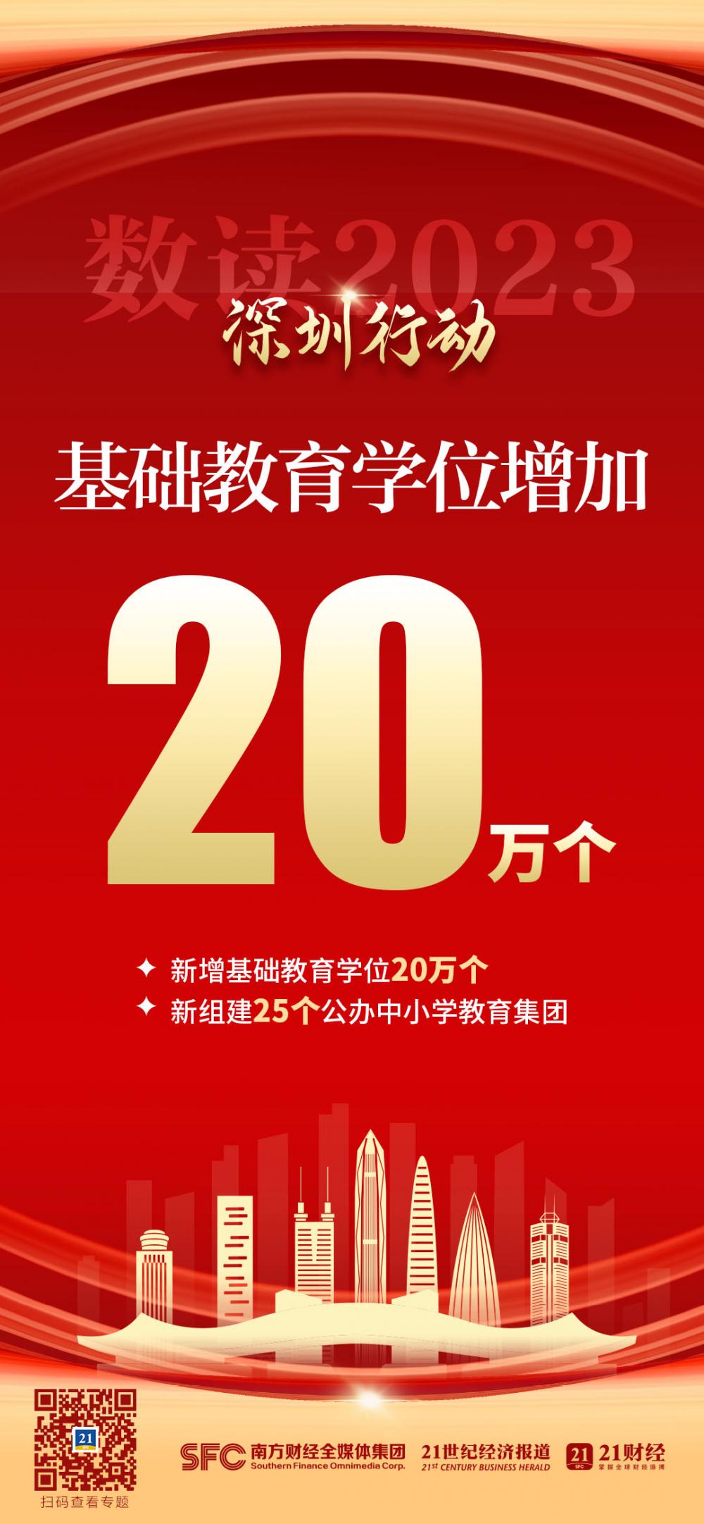 2022年,深圳新增基础教育学位20.6万个;2023年,新增基础教育学位20万个,新组建25个公办中小学教育集团。