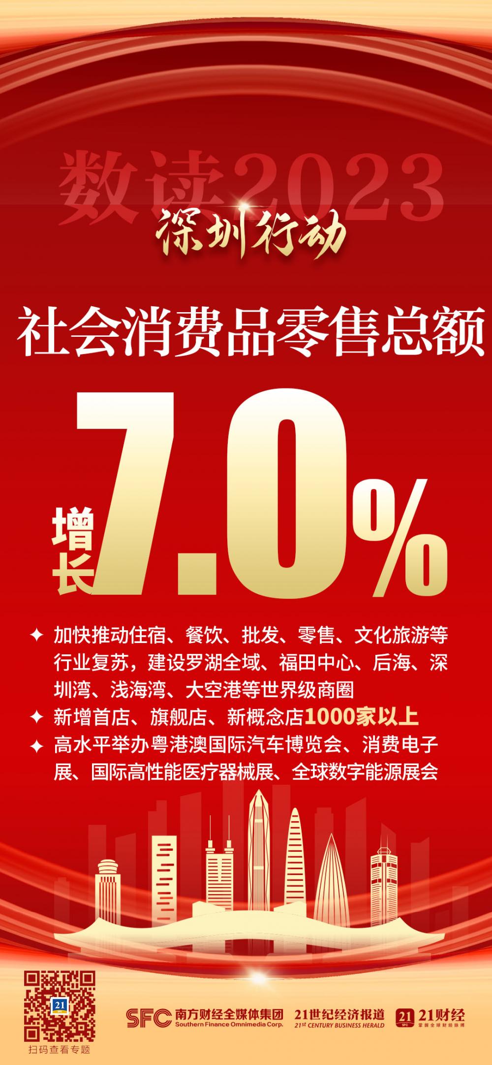 2023年深圳社会消费品零售总额增长7.0%,加快推动住宿、餐饮、批发、零售、文化旅游等行业复苏,建设罗湖全域、福田中心、后海、深圳湾、浅海湾、大空港等世界级商圈。新增首店、旗舰店、新概念店1000家以上。打造国际会展之都,高水平举办粤港澳国际汽车博览会、消费电子展、国际高性能医疗器械展、全球数字能源展会。