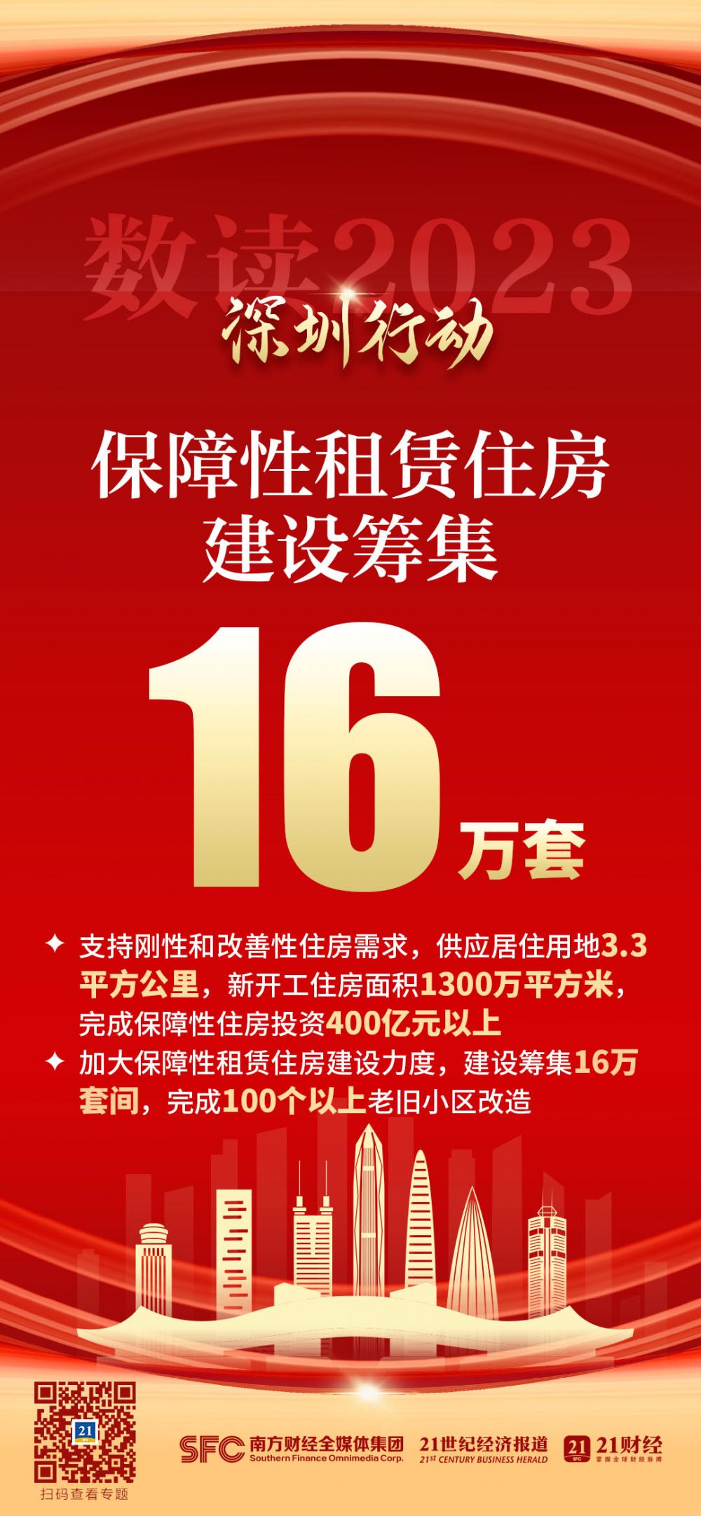 2023年,深圳供应居住用地3.3平方公里,新开工住房面积1300万平方米。完成保障性住房投资400亿元以上;加大保障性租赁住房建设力度,新开工建设60个项目,建设筹集16万套(间);完成100个以上老旧小区改造。