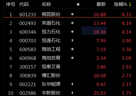 今日(2月14日),石油石化(申万)早盘持续走高,截至发稿,桐昆股份、荣盛石化、恒力石化涨超4%,恒逸石化、海油工程、海油发展等跟涨。