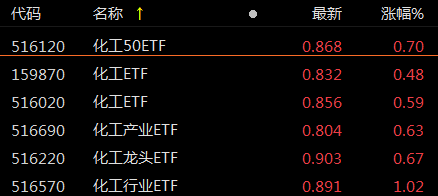 ETF方面,荣盛石化是不少化工ETF十大重仓成分股票,截至发稿,受荣盛石化走强影响,化工行业ETF(516570)涨超1%,化工50ETF(516120)、化工龙头ETF(516220)、化工产业ETF(516690)、化工ETF(516020)等跟涨。