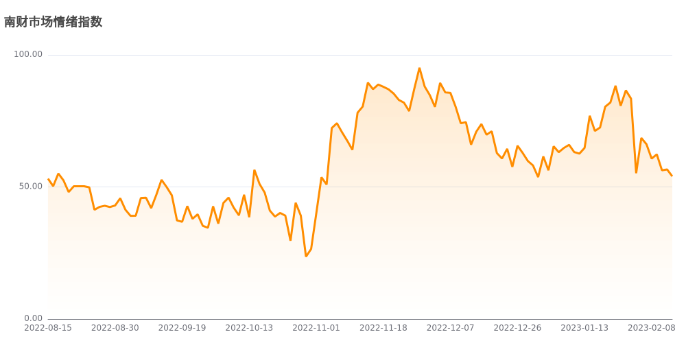 今日南财市场情绪指数为54.0,较前一交易日56.6下跌,市场投资热度降低。