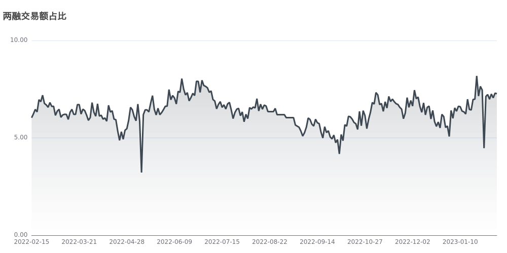 今日该指标值为7.27%,目前该指标处于近一年较高区间,认为当前A股市场相对较强。反映场内投资者借钱炒股的杠杆水平,该指标越高说明杠杆水平越高,即投资者认为当前市场较强,反之则说明投资者认为市场相对较弱,因而与上证指数存在较强的正相关性。