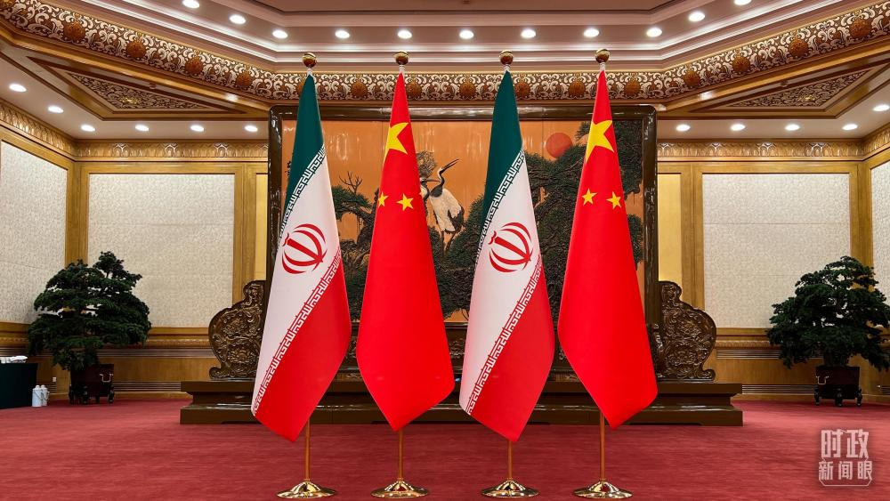 △2月14日会谈现场的中伊两国国旗。(总台央视记者郁振一拍摄)