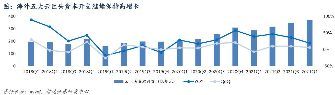 根据中信证券的相关研究,基于云计算市场需求、行业供需格局等因素的系统分析,预计北美云厂商本轮资本支出上行周期有望至少持续到2022年第三季度。