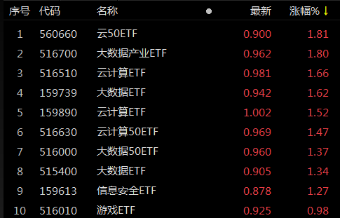 ETF方面,信创相关ETF涨幅居前,云50ETF(560660)、大数据产业ETF(516700)、云计算ETF(516510)、大数据ETF(159739)、云计算ETF(159890)等涨近2%。