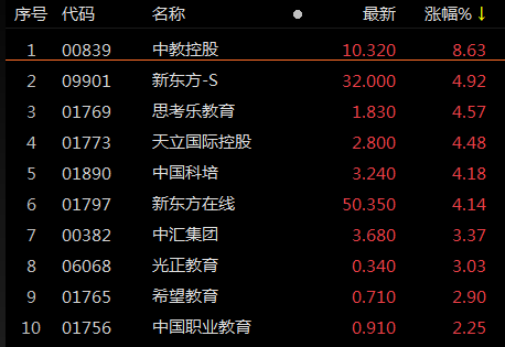 今日(2月16日),港股教育股午后盘中继续走强,截至发稿,中教控股涨超8%,新东方-S、思考乐教育、天立国际控股、中国科培、新东方在线等涨超4%。