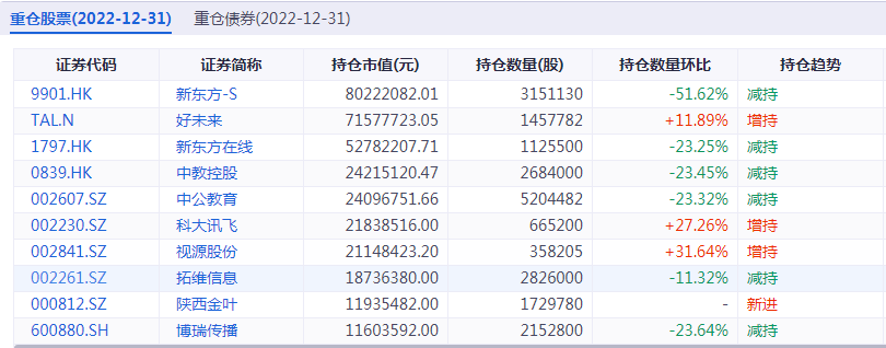 该ETF重仓股中,新东方-S为其第一大重仓股,新东方在线为其第三大重仓股。此外,该ETF第二大重仓股为美股好未来(TAL.N)。