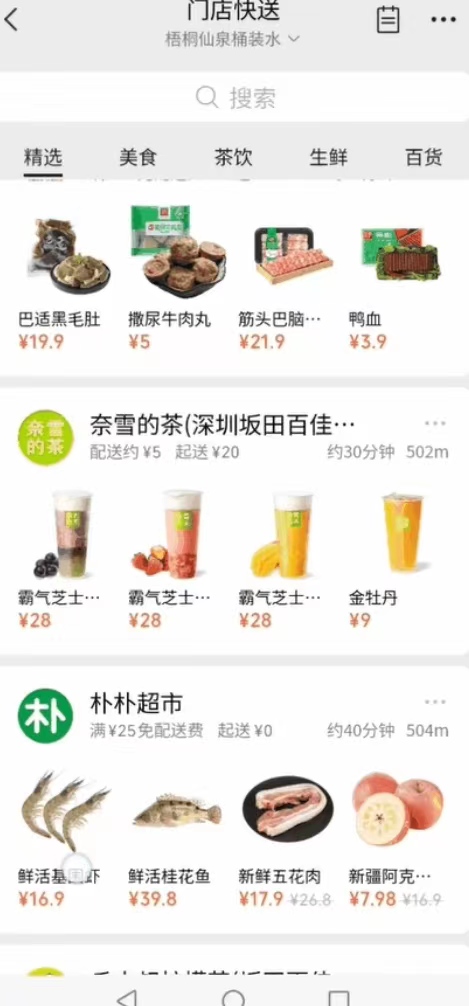 用户仅在“门店快送”中浏览附近可选择的外卖商家,点击商家将直接跳转到品牌小程序,后续点单、支付、配送用户均在商家小程序内独立完成。在价格方面,经过对比,使用“门店外送”功能下单的“奈雪的茶”,价格都与线下门店相同,用户承担配送费、包装费等其他费用。同时起送价由商家自主决定,每个商家的起送价门槛各不相同。