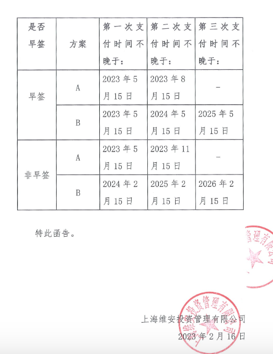 非早签方案A第一次支付时间不晚于2023年5月15日,第二次支付时间不晚于2023年11月15日;方案B第一次支付时间不晚于2024年2月15日,第二次支付时间不晚于2025年2月15日,第三次支付时间不晚于2026年2月15日。
