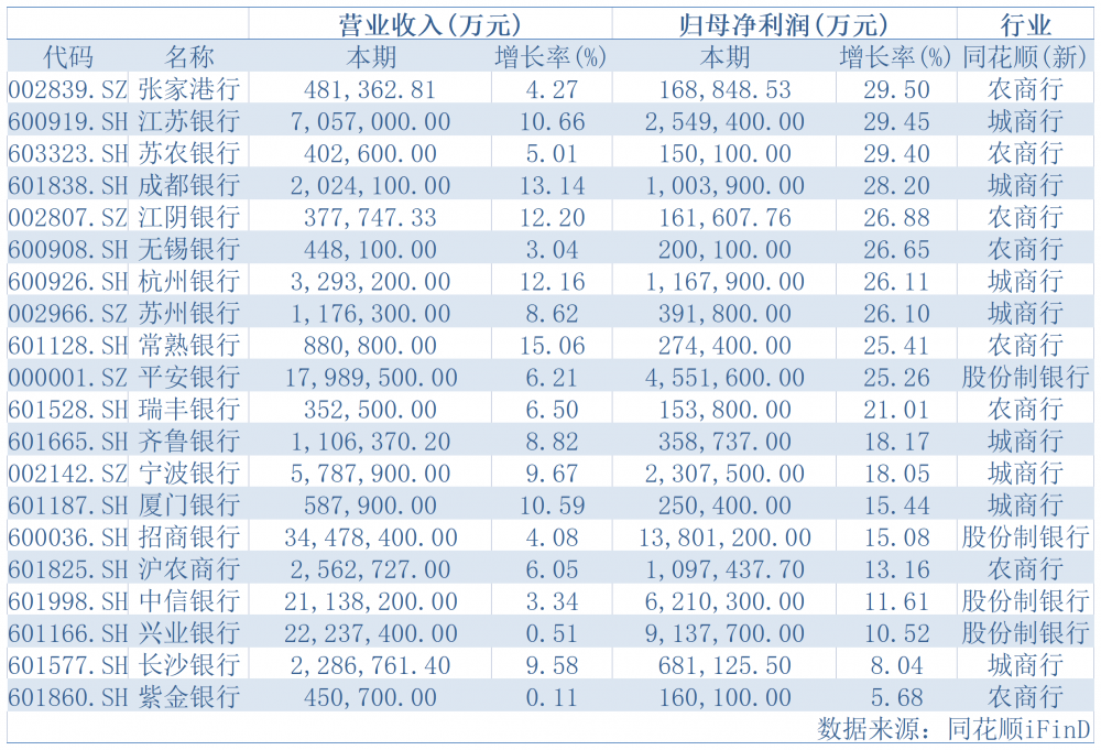 其中,成都银行以28.20%的归母净利润同比增速位列第四,前五名中的另外四家银行则均位于江苏地区,依次为张家港行(29.50%)、江苏银行(29.45%)、苏农银行(29.40%)和江阴银行(26.88%)。紫金银行和长沙银行的增速则相对较慢,归母净利润同比增长率分别为5.68%和8.04%。