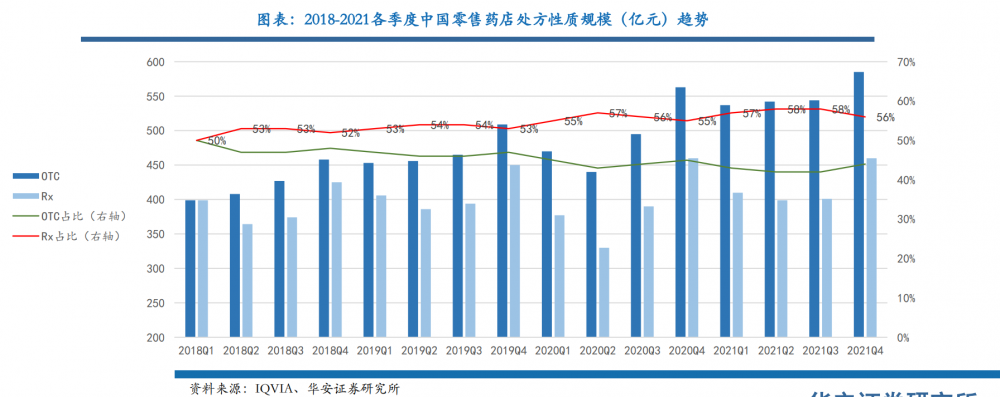 华安证券指出,与2018年零售药店处方药占比50%相比,近年来处方药占比均上升至55%左右,随着处方外流的进一步实施,预计未来占比会继续升高。