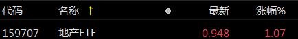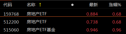 截至发稿,相关ETF——地产ETF(159707)涨超1%,房地产ETF基金(515060)等跟涨。