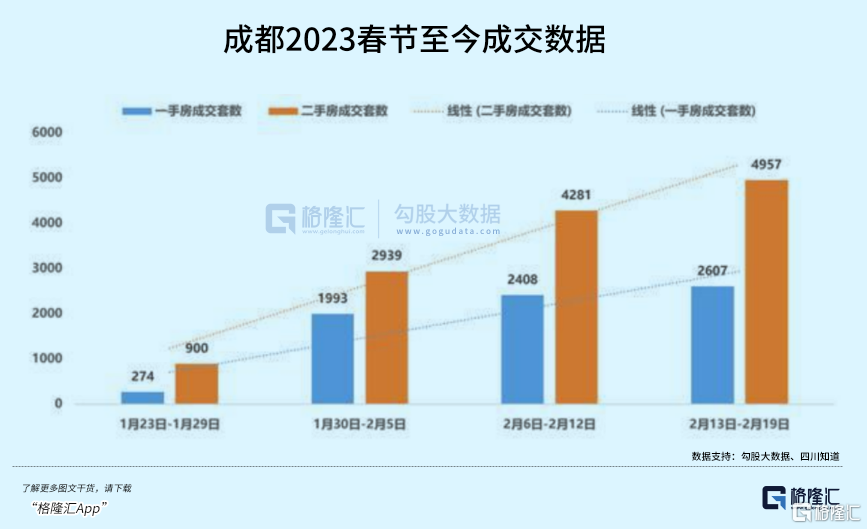 1月23日至2月19日,成都一二手房共计成交20359套,是杭州、南京同期的2倍有余。其中,新房成交7282套,二手房成交13077套。2月6日之后,新房每日成交500套左右,二手房成交800-1000套。