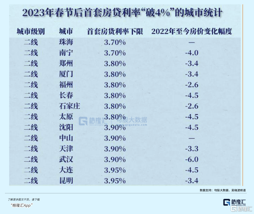 地产需求端,多地因城施策,亦出台了诸多政策。第一个大招,下调按揭抵押贷款利率。其中,包括郑州、珠海、厦门、福州、武汉、天津、太原等14个二线城市首套商贷利率跌破4%。此外,温州、湛江、唐山等17个三线城市同样跌破4%。