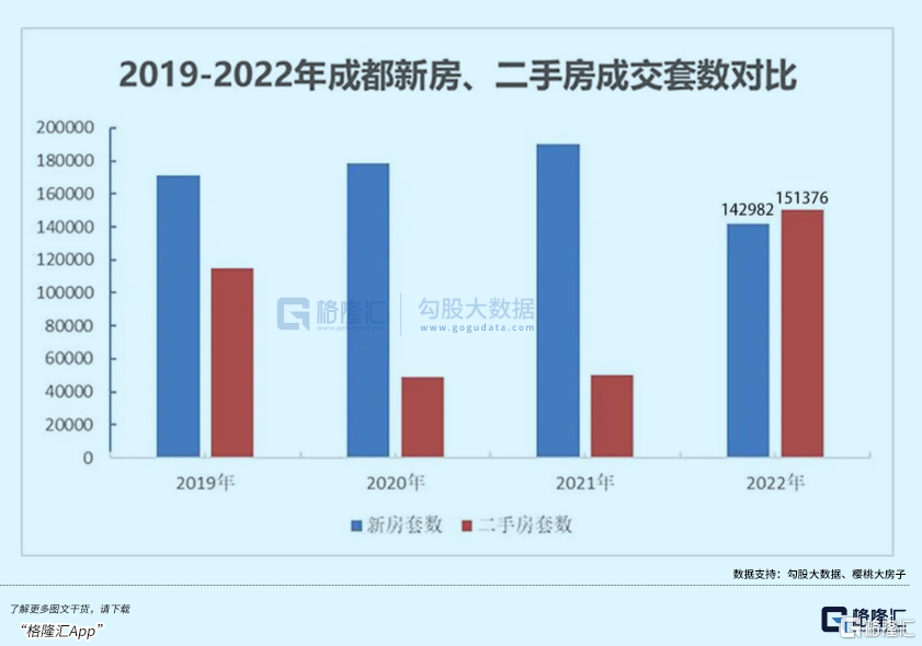 去年,成都二手房累计成交151376套,是2021年成交量的310%。其中,新房成交142982套,同比仍有下跌,但成交量PK掉一线城市,位列全国NO.1。需要说明的是,成都住房市场二手房较为热门,新房市场多呈现出改善特征,因为建面单价与总价较高,成交量要逊色一些。