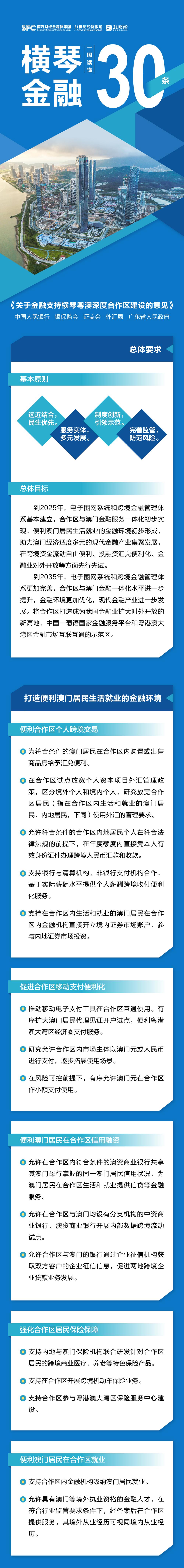 《意见》围绕打造便利澳门居民生活就业的金融环境、促进合作区与澳门金融市场和金融基础设施互联互通、发展助力澳门经济适度多元发展的现代金融产业、促进跨境贸易和投融资便利化、加强金融监管合作等六大方面提出30条具体举措。