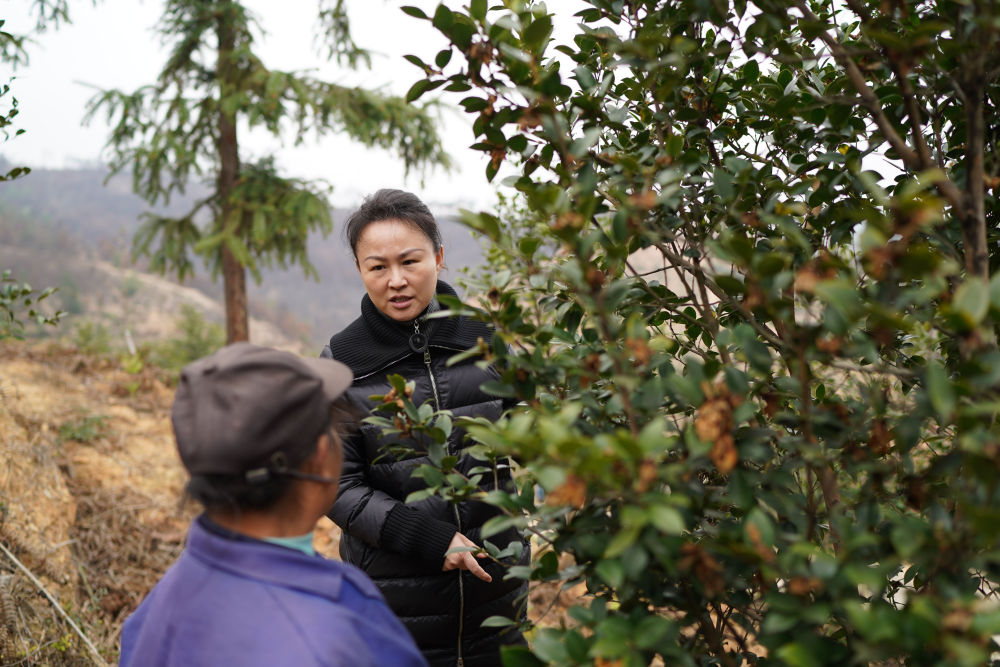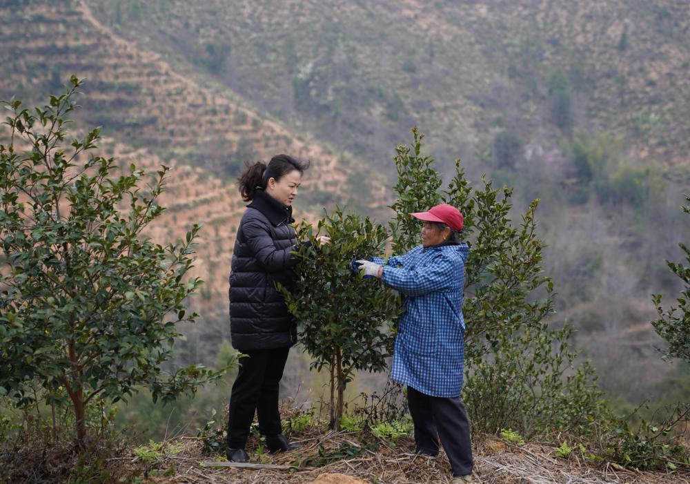 2月24日,明经华(右)在江西赣州市经开区湖边镇蛤湖村白石下油茶基地调研油茶产业。新华社记者 周密 摄