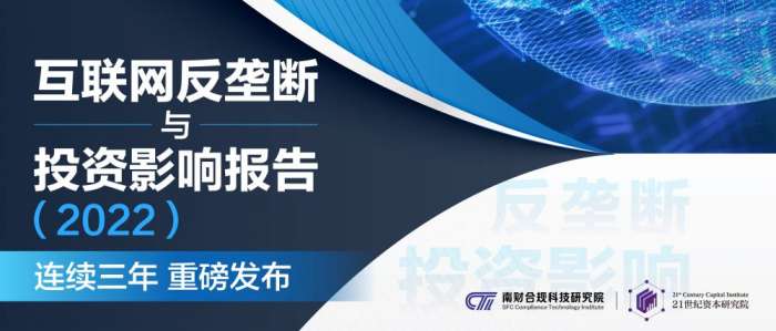 2021年,南财合规科技研究院推出《互联网反垄断与投资影响报告(2020)》,解读反垄断监管趋势与资本市场动向。2022年初,南财合规科技研究院联合21世纪资本研究院,继续推出《互联网反垄断与投资影响报告(2021)》。2023年,《互联网反垄断与投资影响报告(2022)》持续重磅发布,聚焦国内外反垄断的立法修法、执法监管、企业影响,详细解剖2022年在互联网领域发生的监管转向以及互联网商业变革,研判2023年反垄断趋势,从政府监管、企业合规、行业投资等方面给出建议。